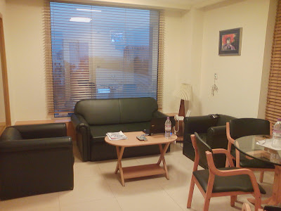 I was then led to my suite. I can say that for a hospital it is comfortable and roomy and I honestly cannot complain, but it hardly lives up to the hype on the website - a tad over-marketed, I would opine. It has two rooms, one sitting room and one bedroom, but the bed is simply a hospital-gurney style bed without a real mattress or blankets. We will see tonight how comfortable it is.